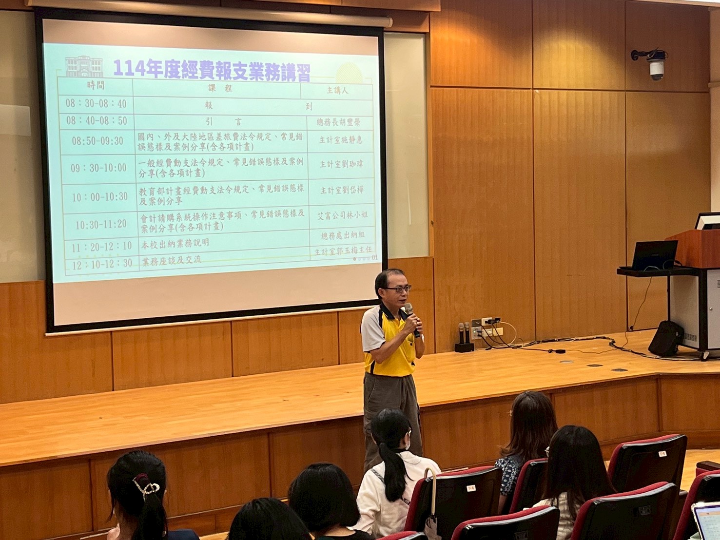 本室於114年10月16日(星期四)假求真樓一樓演講廳舉辦「114年度經費報支業務講習」,共計119人現場簽到,由內部控制專案小組及本室主辦,總務處出納組協辦,課程內容包含「國內、外及大陸地區差旅費法令規定、常見錯誤態樣及案例分享(含各項計畫)、「一般經費動支法令規定、常見錯誤態樣及案例分享(含各項計畫)」、「教育部計畫經費動支法令規定、常見錯誤態樣及案例分享」、「會計請購系統操作注意事項、常見錯誤態樣及案例分享(含各項計畫)」及「本校出納業務說明」課程,開場由胡豐榮總務長引言,主講人員由施靜惠專員、劉珈瑋組員、劉岱樺小姐及艾富系統公司林小姐進行簡報說明,各場次課程提供Q&A提問與現場解答,感謝大家踴躍參加。
